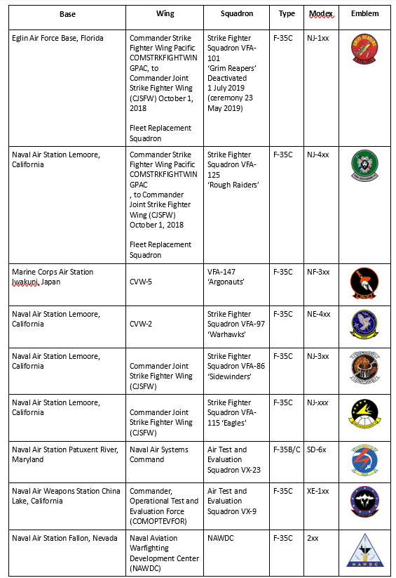 The Fleet Replacement Squadron also provided the conversion training for the United States Marine Corps squadrons that completed or are in the process of completing their transition to the F-35C. Marine Fighter Attack Squadron 314 ‘Black Knights’ operating the aging F/A-18A++ Legacy Hornet started their conversion to the F-35C Lightning II in June 2019 and was the runner up after Strike Fighter Squadron VFA-147 achieved their Safe for Flight status. On 21 June 2019, the squadron retired the F/A-18A++ and began training on the F-35C. The ‘Black Knights conversion training was provided by Strike Fighter Squadron VFA-125 ‘Rough Raiders” VMFA-314 received their first factory fresh aircraft on 1 January 2020 and were based at MCAS Miramar.